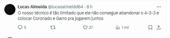 Isso porque, de acordo com o Meu Timão, há uma dúvida sobre quem vai formar o trio ofensivo do time junto com Wesley e Yuri Alberto. O paraguaio vem sendo o titular, mas existe a possibilidade de outro jogador entrar no time.