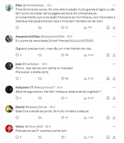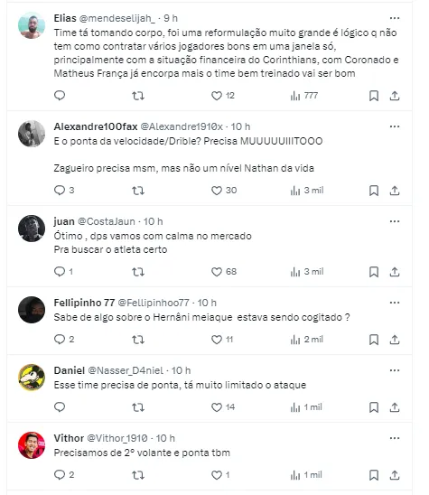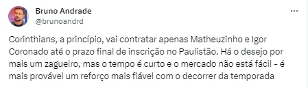 “Corinthians, a princípio, vai contratar apenas Matheuzinho e Igor Coronado até o prazo final de inscrição no Paulistão. Há o desejo por mais um zagueiro, mas o tempo é curto e o mercado não está fácil – é mais provável um reforço mais fiável com o decorrer da temporada”, informou Bruno Andrade.