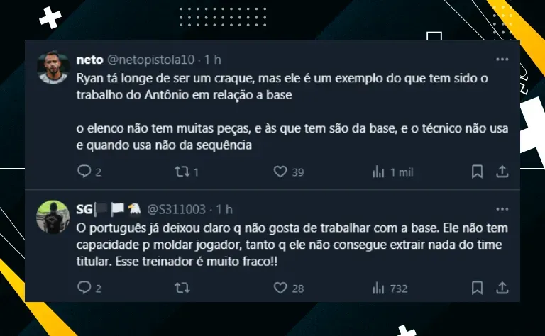 Posto isso, uma das críticas ao trabalho do português é a baixa utilização de nomes que foram destaques na base, como o garoto Ryan, que foi titular na campanha da Copinha este ano e já atua pelo profissional desde 2023.