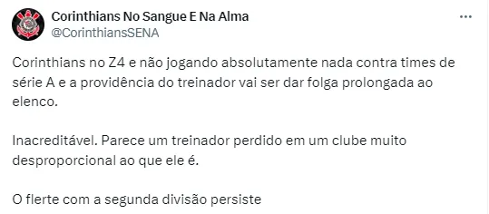 A decisão do treinador corinthiano fez alguns torcedores se manifestarem. Pelo X, antigo Twitter, houve quem criticou veementemente o comandante: “Inacreditável. Parece um treinador perdido em um clube muito desproporcional ao que ele é”, disse um.