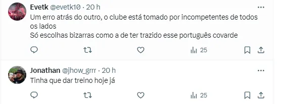 Outro complementou, indo na mesma linha: “Um erro atrás do outro, o clube está tomado por incompetentes de todos os lados. Só escolhas bizarras como a de ter trazido esse português covarde”, afirmou.