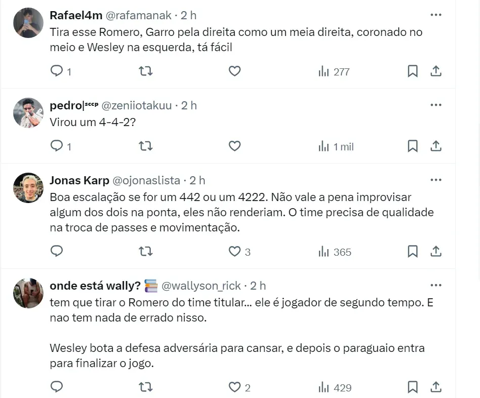 No empate do último domingo (14), contra o Atlético Mineiro, a Fiel Torcida questionou o treinador português não ter colocado os meias Rodrigo Garro e Igor Coronado em campo ao mesmo tempo.
