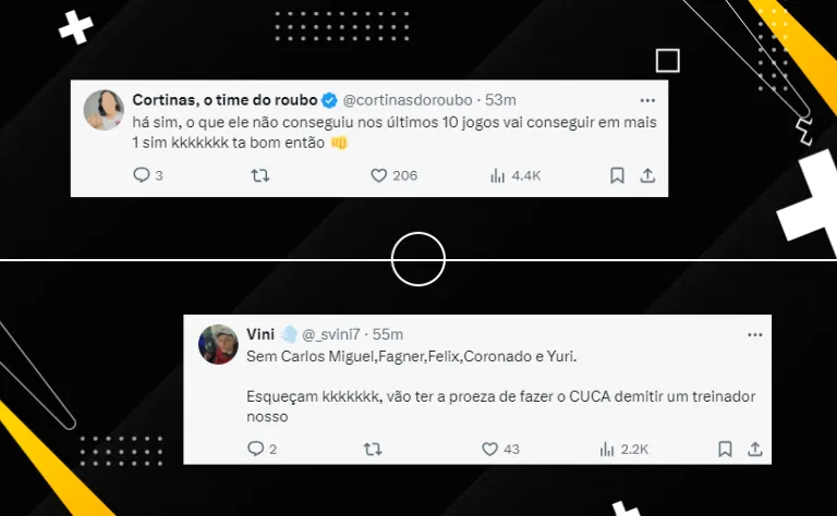 Porém, mesmo com a desconfiança da torcida e pressão nos bastidores, Augusto Melo decidiu dar mais uma chance ao treinador, que será contra o Athletico-PR, na próxima rodada.