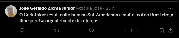 A derrota para o Botafogo deixou o Timão na zona de rebaixamento, é o atual 17° colocado, com apenas cinco pontos somados. A campanha conta com uma vitória, dois empates e quatro derrotas. A torcida também não aprova algumas opções do treinador.