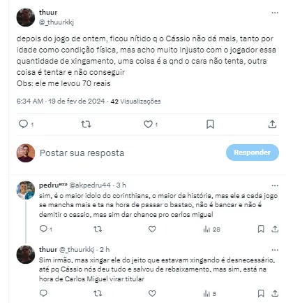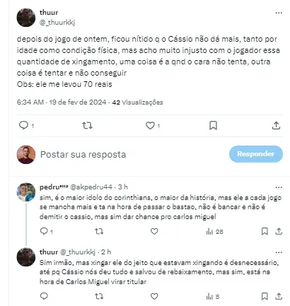 “Depois do jogo de ontem, ficou nítido que o Cássio não dá mais, tanto por idade como condição física, mas acho muito injusto com o jogador essa quantidade de xingamento, uma coisa é quando o cara não tenta, outra coisa é tentar e não conseguir”, disse um corinthiano.