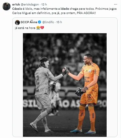 Já teve gente pedindo que Carlos Miguel seja titular absoluto da equipe. “Cássio é ídolo, mas infelizmente a idade chega para todos. Próximos jogos, Carlos Miguel em definitivo, para já, para ontem, para agora”.