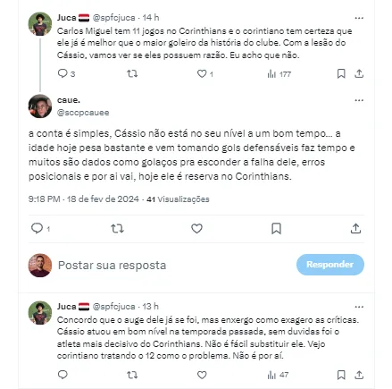 “A conta é simples, Cássio não está no seu nível a um bom tempo… a idade hoje pesa bastante e vem tomando gols defensáveis faz tempo e muitos são dados como golaços para esconder a falha dele, erros posicionais e por aí vai, hoje ele é reserva no Corinthians”, afirmou outro torcedor.