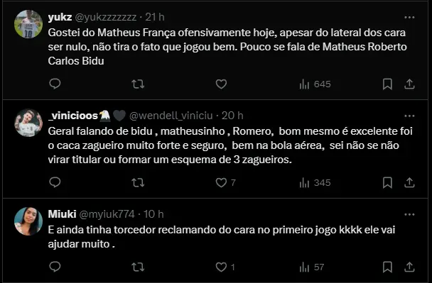 Contratado junto ao Flamengo, Matheus França chegou ao Corinthianspara disputar posição com Fagner. Todavia, o defensor de 23 anos ainda não convenceu para receber mais chances entre os titulares.