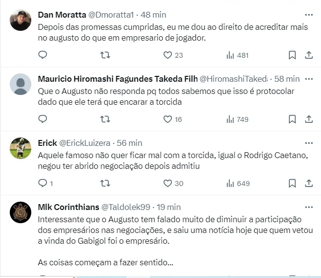 Além disso, Augusto Melo não garantiu que o Corinthians irá negociar com Gabigol no meio do ano: “Vai depender de como estivermos no meio do ano, espero que bem. Todo bom atleta que tenha nossas características vai interessar. É isso que queremos. Vamos estar sempre de olho no mercado”, declarou.