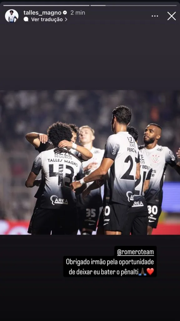 Minutos depois do fim da partida, em post na rede social Instragam, Talles Magno agradeceu Romero, com a mensagem: “Obrigado irmão pela oportunidade de deixar eu bater o pênalti”. Confira: