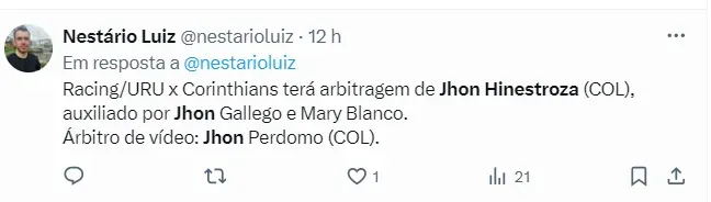 O árbitro escalado para a partida foi o colombiano Jhon Hinestroza, que apita jogos da primeira divisão da Colômbia desde 2017, acumulando algumas polêmicas durante sua trajetória como árbitro.