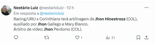 Um meme que encontrei na ColômbiaTT do árbitro Jhon Hinestroza, que apita Corinthians x Racing-URU, nesta terça: pic.twitter.com/IbwR6xKTxM