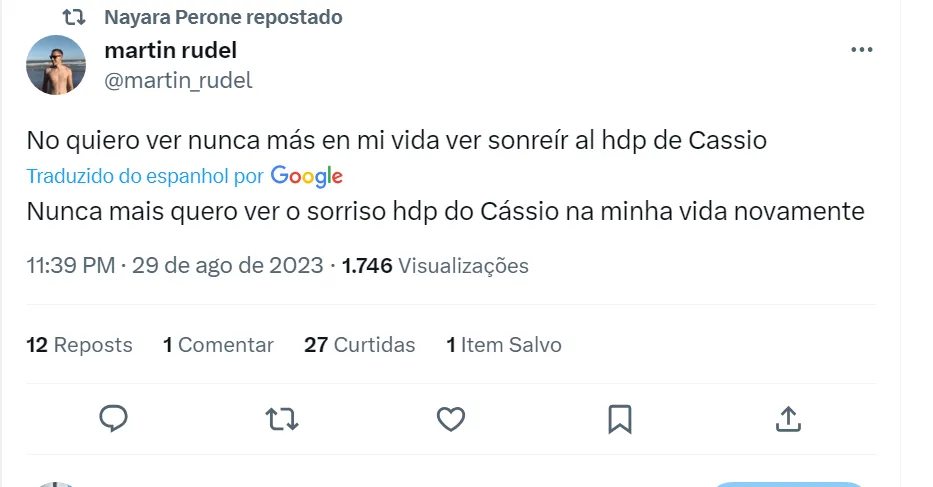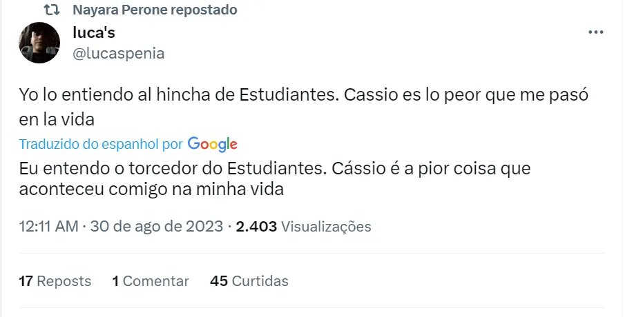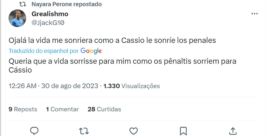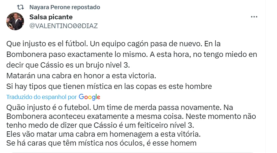 “Desde 2012 Cássio arruína a vida da maioria dos argentinos”, disse outro torcedor do Boca Juniors no Twitter. Vale lembrar que o Corinthians com Cássio como titular foi campeão da Copa Libertadores em 2012 diante do Boca. Já no ano passado, o Timão voltou a enfrentar o time de La Bombonera na competição continental e eliminou o rival nos pênaltis, com o goleiro corintiano pegando duas cobranças de pênaltis.