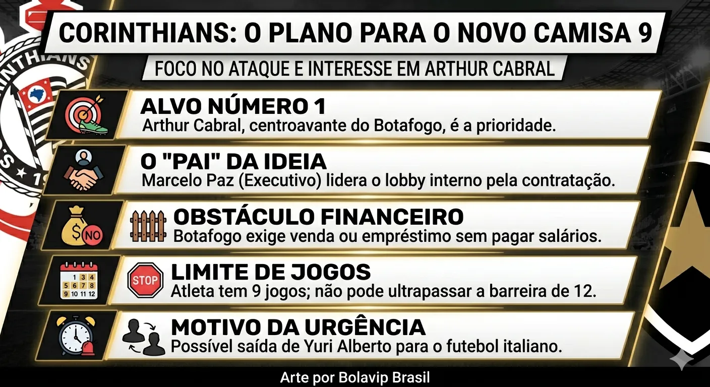 Um nome que tem lobby fortíssimo com Marcelo Paz, executivo de futebol do Timão, é Arthur Cabral. A informação é de Samir Carvalho. O setorista do Corinthians garante que o jogador segue no radar para julho.