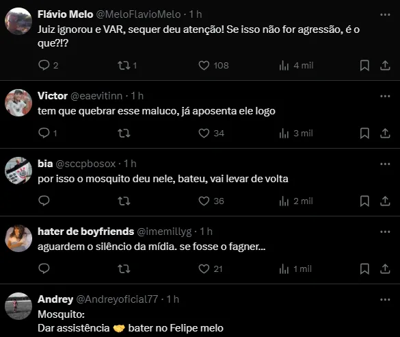 “Juiz ignorou e VAR, sequer deu atenção! Se isso não for agressão, é o que?!?”, “Ele pode tem raça, mas se é o Fagner….”, e “Agora se fosse o Fagner….. anulariam até o gol”, foram alguns comentários.