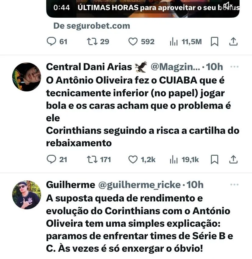 António Oliveira: 4.0 O Corinthians está passando por um retrocesso, não há evolução no trabalho do treinador. As substituições não deram certo.