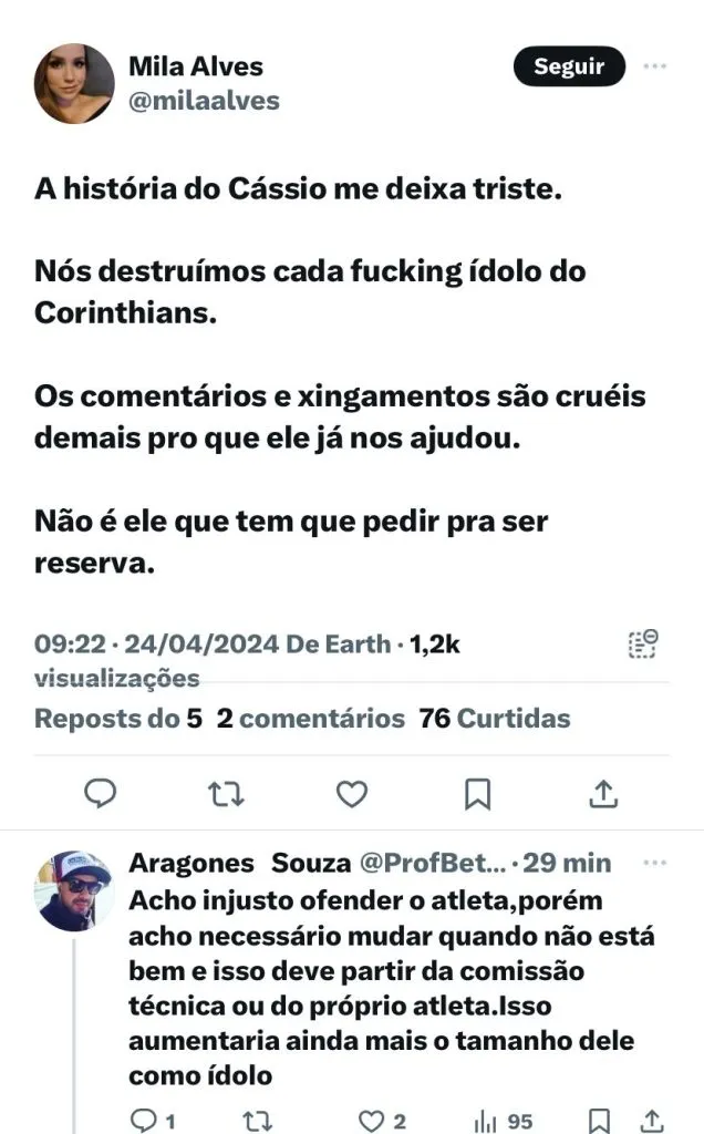 A partida também ficou marcada pelo forte desabafo do goleiro Cássio. O ídolo falhou no gol e expôs sua situação fora das quatro linhas: “A cobrança faz parte. Mas não faz parte quando passa dos limites, a falta de respeito. Eu sabia que esse ano saíram muitos jogadores, eu era um dos mais velhos ano passado, mas tinha o fulano, ou ciclano… Eu fiquei um dos mais velhos, sabia que a cobrança seria grande. Errei sim, mas parece que tudo dê errado no Corinthians é minha culpa. Se eu sou o maior culpado talvez seja o momento de sair e seguir meu caminho”, disse.