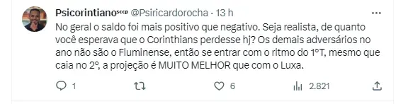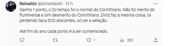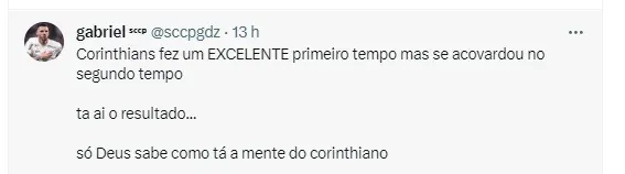 O que se viu foi duas equipes diferentes nos dois tempos. No primeiro, um time querendo atacar, raçudo, com disposição. Porém, no segundo, o lado físico, aparentemente, pesou. O Timão recuou muito, e foi finalizar apenas no fim do jogo. Isso foi um prato cheio para o Fluminense, que sendo uma grande equipe, acabou martelando até chegar ao empate. Enquanto em um tempo ficou a sensação de um novo time, o segundo fez lembrar do time de Luxemburgo.