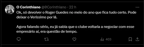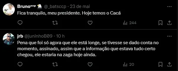 Dessa maneira, a torcida do Timão cobrou Augusto Melo, que estava nos primeiros dias no cargo de presidente, uma explicação desse caso. A equipe ficou sem um zagueiro e precisou ir atrás de outro rapidamente.