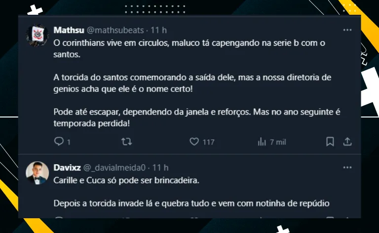 Vale lembrar que, de acordo com informações publicadas neste sábado (29) pelo jornalista Marco Bello, os nomes de Fábio Carille e Cuca são os favoritos de Augusto Melo e devem ser as primeiras opções.