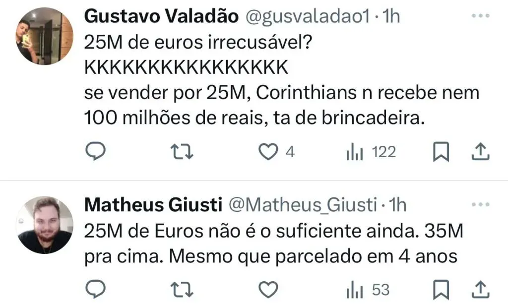 Recentemente, o West Ham, da Inglaterra, enviou uma proposta de 15 milhões de euros, cerca de R$ 82,19 milhões na atual cotação, para contar com o atleta na próxima temporada europeia. Na ocasião, Augusto Melo não vendeu o profissional. Agora, os ingleses, segundo a ESPN querem melhorar subir a oferta para € 18 milhões (cerca de R$ 100 milhões na cotação atual).