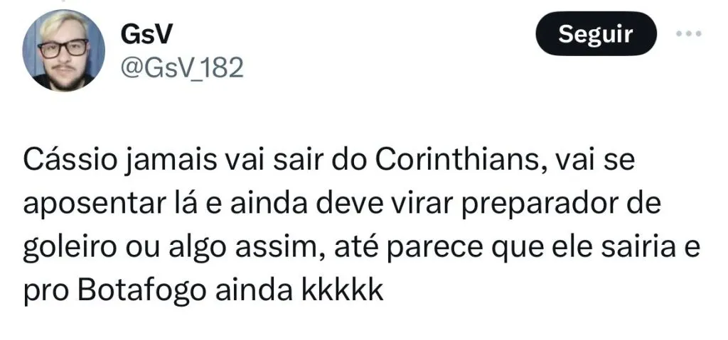De acordo com o jornalista Wellington Arruda, o Botafogo, que está atrás de um goleiro para substituir Lucas Perri, que deve ir ao Lyon, da França. E o nome que Textor queria contratar para o fogão é de um ídolo do Timão: Cássio.