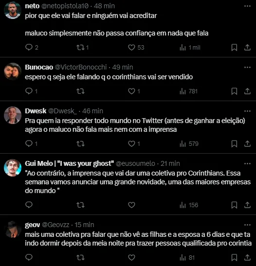Porém, até então, o mandatário corinthiano não tinha se manifestado a respeito de todas essas situações. Coincidência ou não, após ser cobrado por torcedores, ele decidiu, finalmente, quebrar o silêncio.