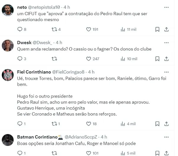 “Ué, trouxe Torres, bom, Palacios parece ser bom, Raniele, ótimo, Garro foi bem. Hugo foi o outro presidente. Pedro Raul sim, acho um erro pelo valor, mas ele apenas aprovou. Gustavo Henrique, uma incógnita. Se vier Coronado e Matheus serão bons reforços”.