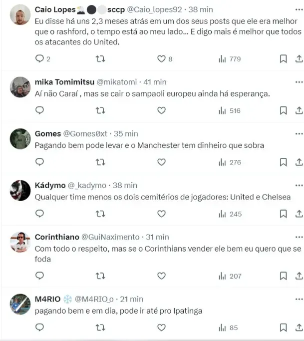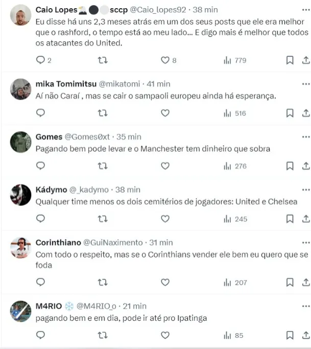 “Empresário gente boa que confia no projeto. Temos uma multa, um bom contrato, gestão qualificada. Veio uma nova sondagem, conversamos e era cedo. Estamos valorizando, já teriam vendido na primeira sondagem. Vamos ganhar muito bem. Mostra alguém igual a esse garoto?. breve está na Seleção. Será a maior venda da história do Corinthians. Tem um futuro brilhante, a comissão precisa do garoto“, continuou.