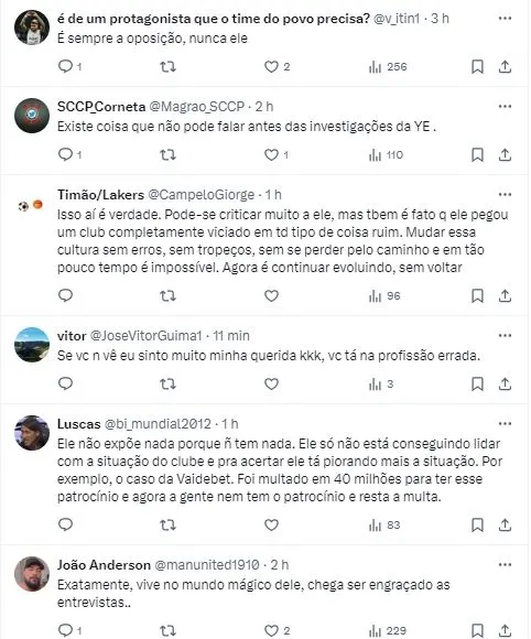 “A Vai de Bet saiu, o Corinthians é grande e dá retorno a qualquer um. Saiu uma e já tem seis ou sete. Não só bets, empresa mesmo. Mostra a credibilidade da gestão. No mesmo dia, começamos reuniões com várias situações. Várias empresas. Se Deus quiser vamos anunciar em pouco tempo”, revelou o presidente.