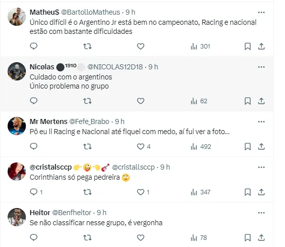 O Timão terá pela frente o Argentinos Juniors, da Argentina, ex-time de Fausto Vera, o Racing Montevideo, do Uruguai, e o tradicional Nacional, do Paraguai. A estreia deve ocorrer na primeira semana de abril. Os jogos prometem ser muito difíceis.