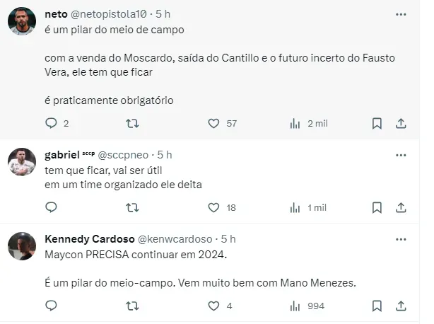 Em contrapartida, vem sendo debatidos nomes de atletas que tem seus contratos se encerrando no fim deste ano e que podem sair do Clube Paulista em 2024. Um deles é o volante Maycon, que pertence ao Shakhtar Donetsk, da Ucrânia.