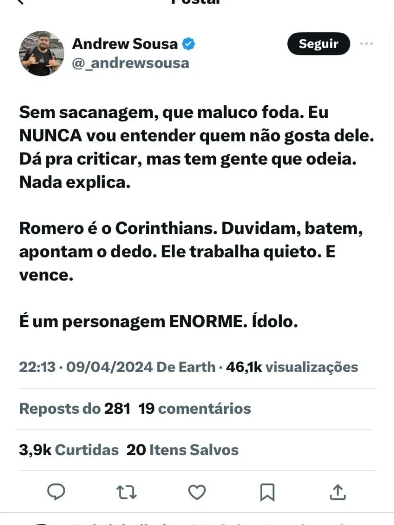 Lazaroni destacou a importância dos números de Romero com o Manto do Timão: “Esse número do Romero é importante, tem que enaltecer, mas quem ganha é a equipe, destaques individuais são importantes, mas o mais importante é a equipe. Estamos felizes por ele, mas pelo resultado principalmente, tem que valorizar o que eles fizeram hoje, disse.