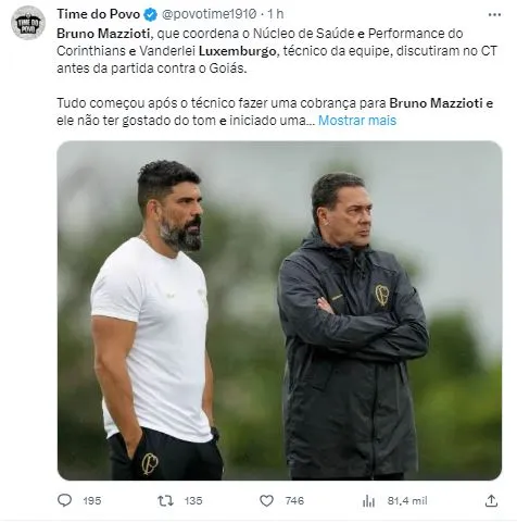 O técnico Vanderlei Luxemburgo e o coordenador do Núcleo de Saúde e Performance, Bruno Mazzioti, tiveram uma pesada discussão. Luxa fez uma cobrança ao fisioterapeuta e Mazzioti não gostou da maneira como o treinador se posicionou. Com isso, o bate-boca teve início. Entretanto, a conversa ficou mais pesada quando o treinador foi informado que Renato Augusto teria que fazer testes para saber se poderia ser escalado diante do Estudiantes, nesta terça-feira (29), pela Copa Sul-Americana.