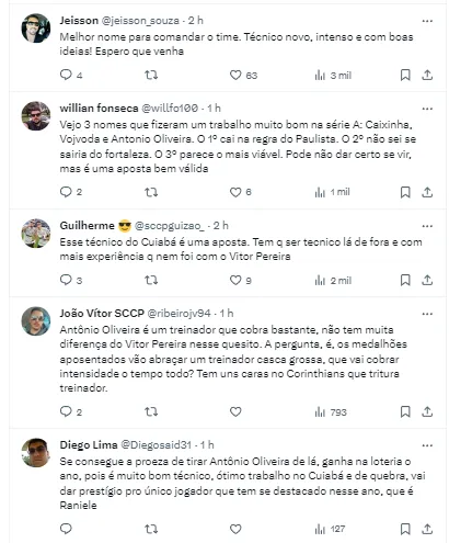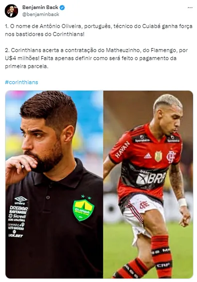 O nome de Antônio Oliveira, português, técnico do Cuiabá, ganha força nos bastidores do Corinthians”, informou Benjamin Back em postagem em suas redes sociais.