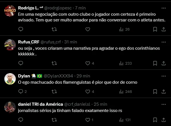 “Não procede a narrativa de que estão querendo atribuir, pelos setoristas que cobrem o Corinthians. Como eu vou enviar a proposta para um time sem que eu ache que as coisas não estavam adiantadas? Tem que ser muito menino, muito amador…”, disparou o dirigente, que continuou.