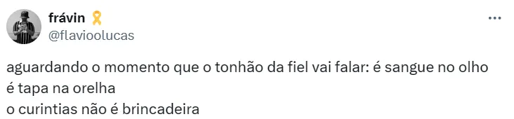“Agora é poucas palavras e mais ações, mostrar que aqui é Corinthians. É sangue no olho dessa merda. Hoje nós temos a oportunidade de corrigir o passado, o passado que vocês já viveram. Escrever uma nova história, hoje nós somos mais fortes do que eles. Sejam fortes, corajosos, tenham sangue no olho e ganhem o jogo”, disse o português.