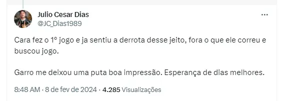 A atitude do meio-campista foi alvo de elogios por parte de alguns torcedores na web. Houve quem valorizou por sua postura dentro e fora de campo. O entendimento é que ele mostrou se importar.