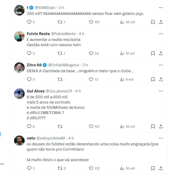O goleiro, vale lembrar, atualmente recebe o valor de R$ 250 mil mensais. O jogador, no entanto, após assumir o posto de titular do Corinthians, quer ganhar o valor correspondente ao cargo que representa.