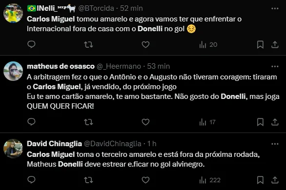 “Carlos Miguel fora do próximo jogo, vem ai o Donelli pra acabar com tudo de vez”, “Carlos Miguel levou amarelo e ta fora do proximo jogo ta ai o Donelli pra quem tava pedindo” e ” A gente vai perder o Carlos Miguel e deixar o Donelli que tem meio metro de altura”, foram alguns comentários.