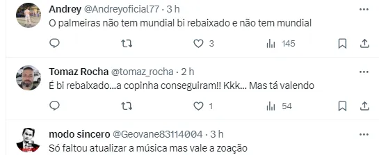 “O Palmeiras não tem mundial (2x). Não tem Copinha, não tem Mundial (2x)”, cantou. A música, no entanto, está desatualizada, uma vez que o rival foi campeão da Copa São Paulo de Futebol Júnior nas edições de 2022 e 2023.