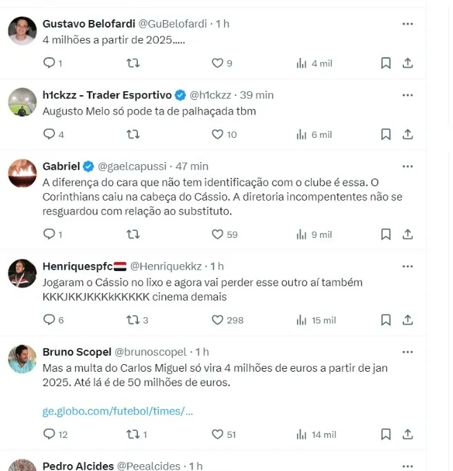 “Carlos Miguel pode DEIXAR o Corinthians na janela. Existem clubes da Inglaterra e Itália que já sinalizaram que vão pagar a multa do goleiro do Corinthians!“, escreveu André Hernan em seu X.