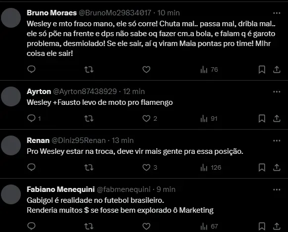O portal ainda traz que Wesley é um nome bem visto pela diretoria do Flamengo. Aos 18 anos, o jovem fez sua primeira temporada no profissional e alternou a posição de titular e reserva com os diversos treinadores do Corinthians, como Fernando Lázaro, Mano Menezes e Vanderlei Luxemburgo.