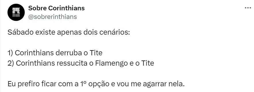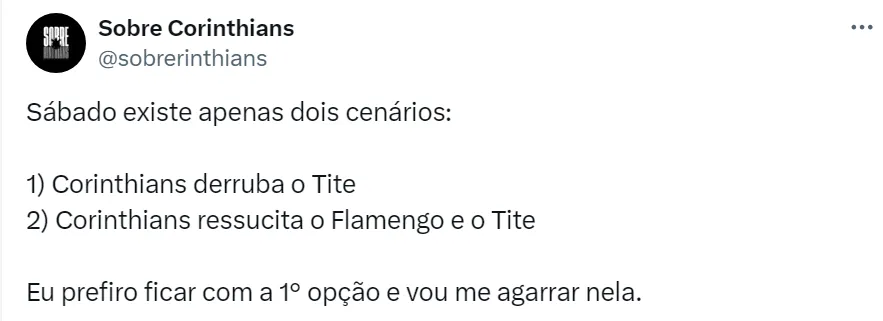 O próximo compromisso do Corinthians é justamente contra o Flamengo, que vem de uma derrota para o Palestino, do Chile, pela Copa Libertadores e Tite está sofrendo muitas críticas no Rubro-Negro.