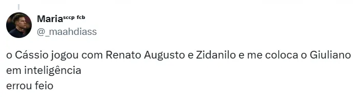 Em comentários nas redes sociais, a Fiel não concordou quando Cássio citou Giuliano como o jogador mais inteligente e que esse lugar poderia ter sido dado para o ‘Rei’ ou até mesmo para Danilo.
