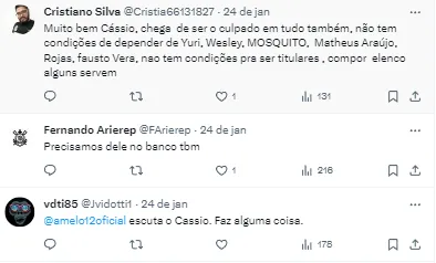 “Tivemos uma conversa com o Cássio. Pediu desculpas, falou que foi infeliz e ele realmente foi infeliz. Nós estamos com elenco curto e a gente sabe. Só que ele também sabe a hora que eu chego e a hora que eu saio de lá. Ele é líder do grupo, uma pessoa do bem, ele reconheceu que foi infeliz. Tá tudo certo”, revelou o dirigente.