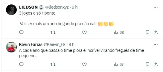 O rendimento da equipe na competição nacional é assustador. Em três partidas, empatou na estreia, contra o Atlético Mineiro e emendou duas derrotas na sequência. Além do Bragantino, havia perdido para o Juventude, em Caxias do Sul, por 2 a 0.