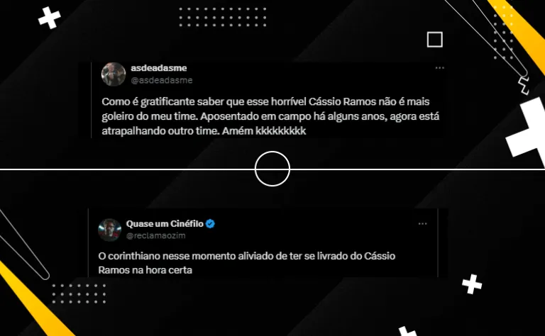 “O corinthiano nesse momento aliviado de ter se livrado do Cássio Ramos na hora certa”. “É Cássio Ramos, a conta chega…”. “Impressionante que ele consegue repetir o mesmo lance duas vezes”, provocaram torcedores do Alvinegro do Parque São Jorge sobre o jogo.