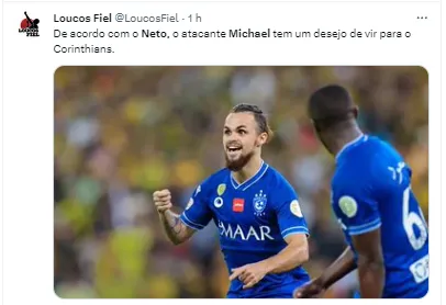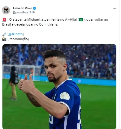 “Craque Neto trouxe a informação no Os Donos da Bola de que o atacante Michael, ex-Flamengo e hoje no Al Hilal, da Arábia Saudita, tem interesse de deixar o futebol árabe e jogar no Corinthians”, publicou o perfil do Os Donos da Bola.