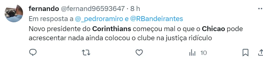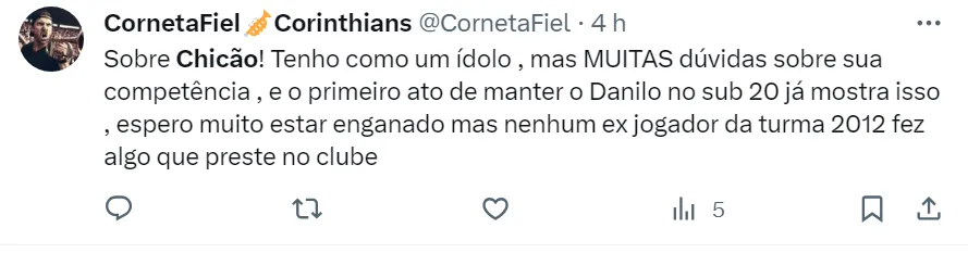 Em entrevista à Rádio Bandeirantes, Chicão detalhou o cargo que vai assumir na gestão de Augusto Melo. Segundo ele, a sua função será trabalhar na transição dos jogadores da base para o profissional.